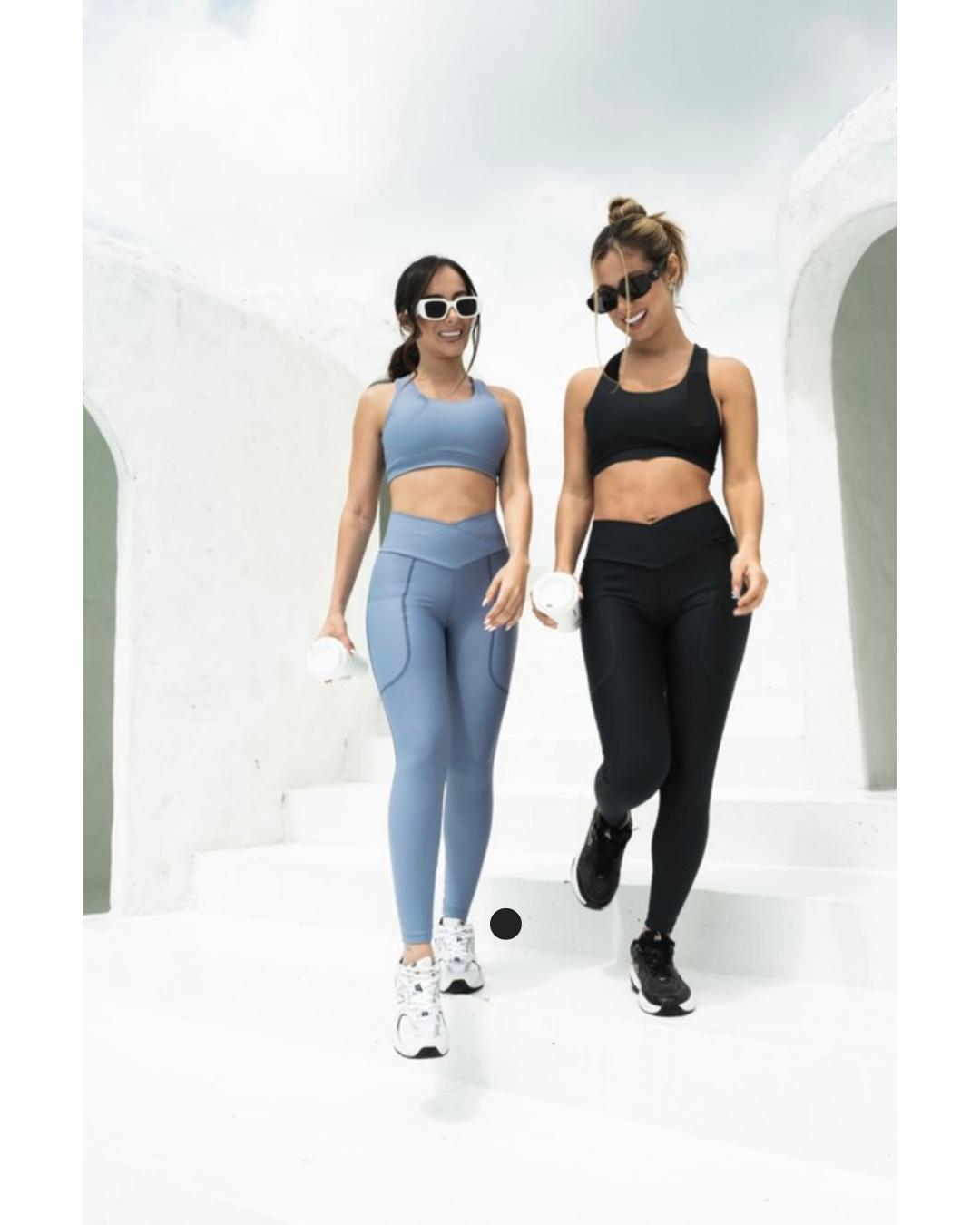 Conjunto deportivo de dos piezas en tono azul suave. El top ofrece soporte medio con un diseño de tirantes cómodos, ideal para entrenamientos funcionales o días activos. El legging de cintura alta cuenta con bolsillos laterales funcionales, perfectos para llevar lo esencial sin perder estilo. Fabricado con tela elástica y suave al tacto que moldea la figura.